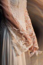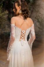 – Model cu bust imbracat in dantela pe partea de corset, maneci in forma de A din dantela, corset reglabil, fusta ampla din matase