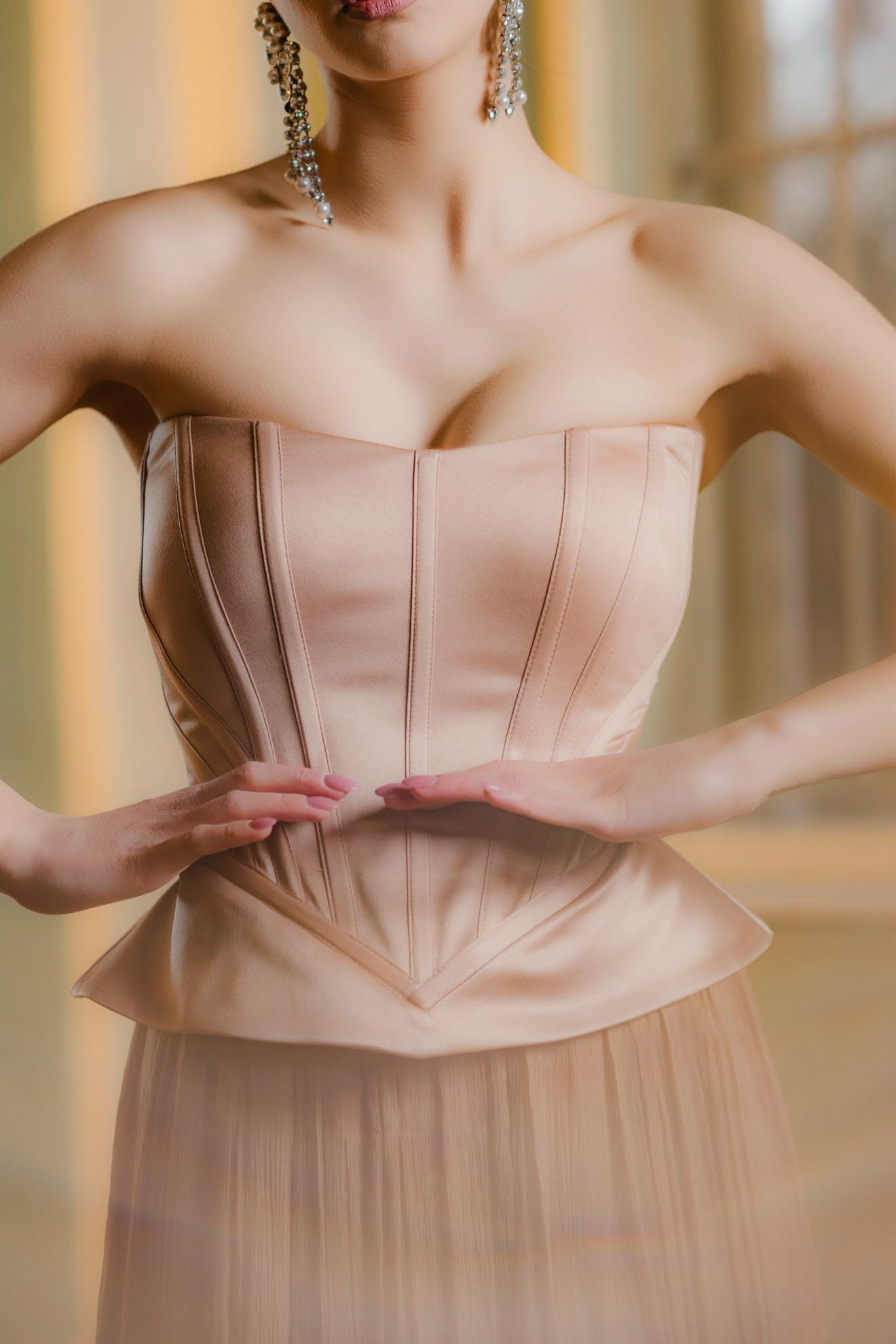 – Corset reglabil cu ate si fermoar ascuns pe fusta
