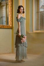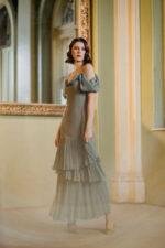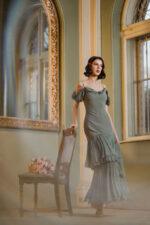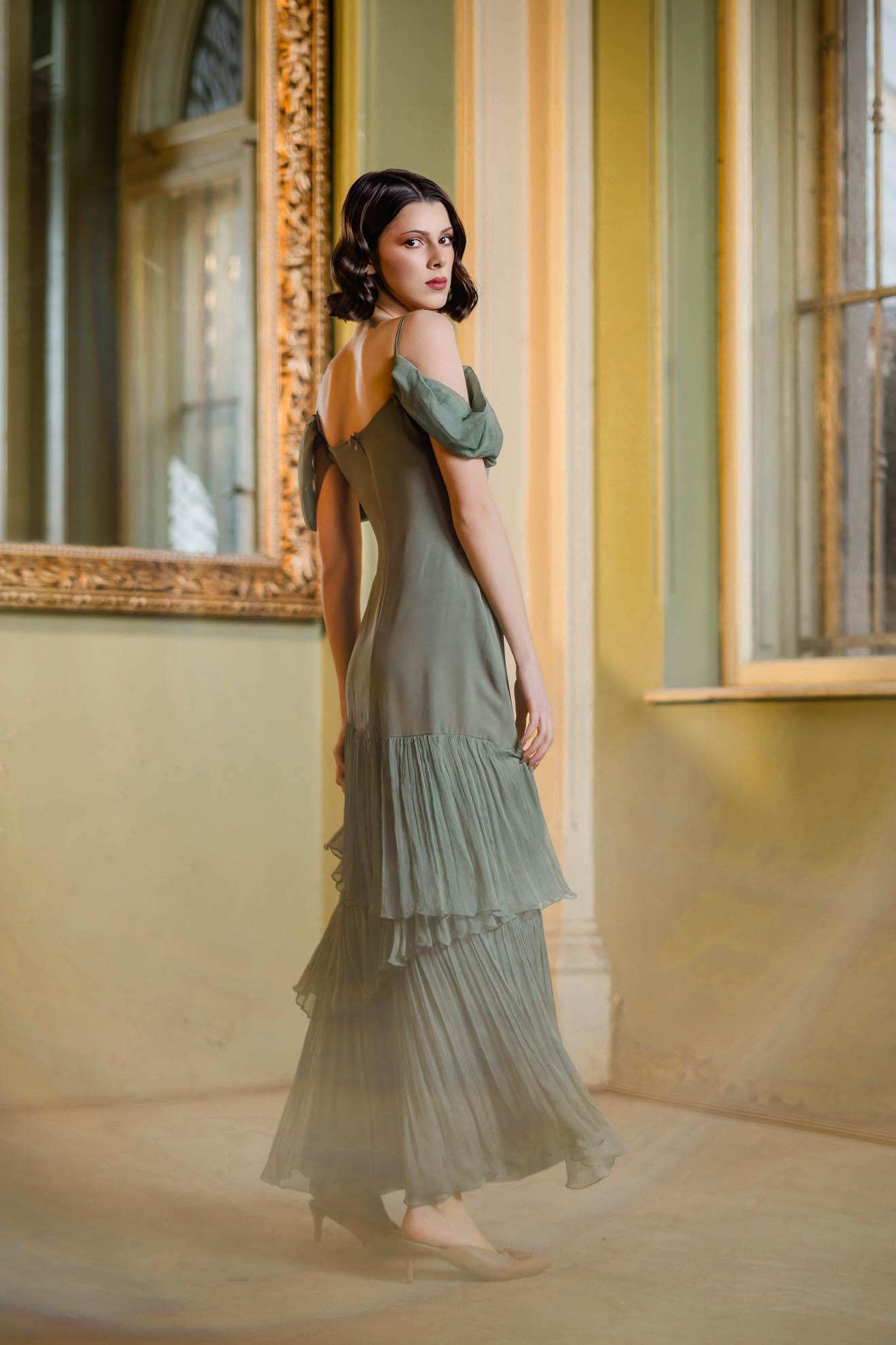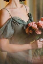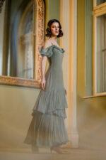 – Model tip furou in partea de sus din matase si volane asimetrice din matase pe fusta