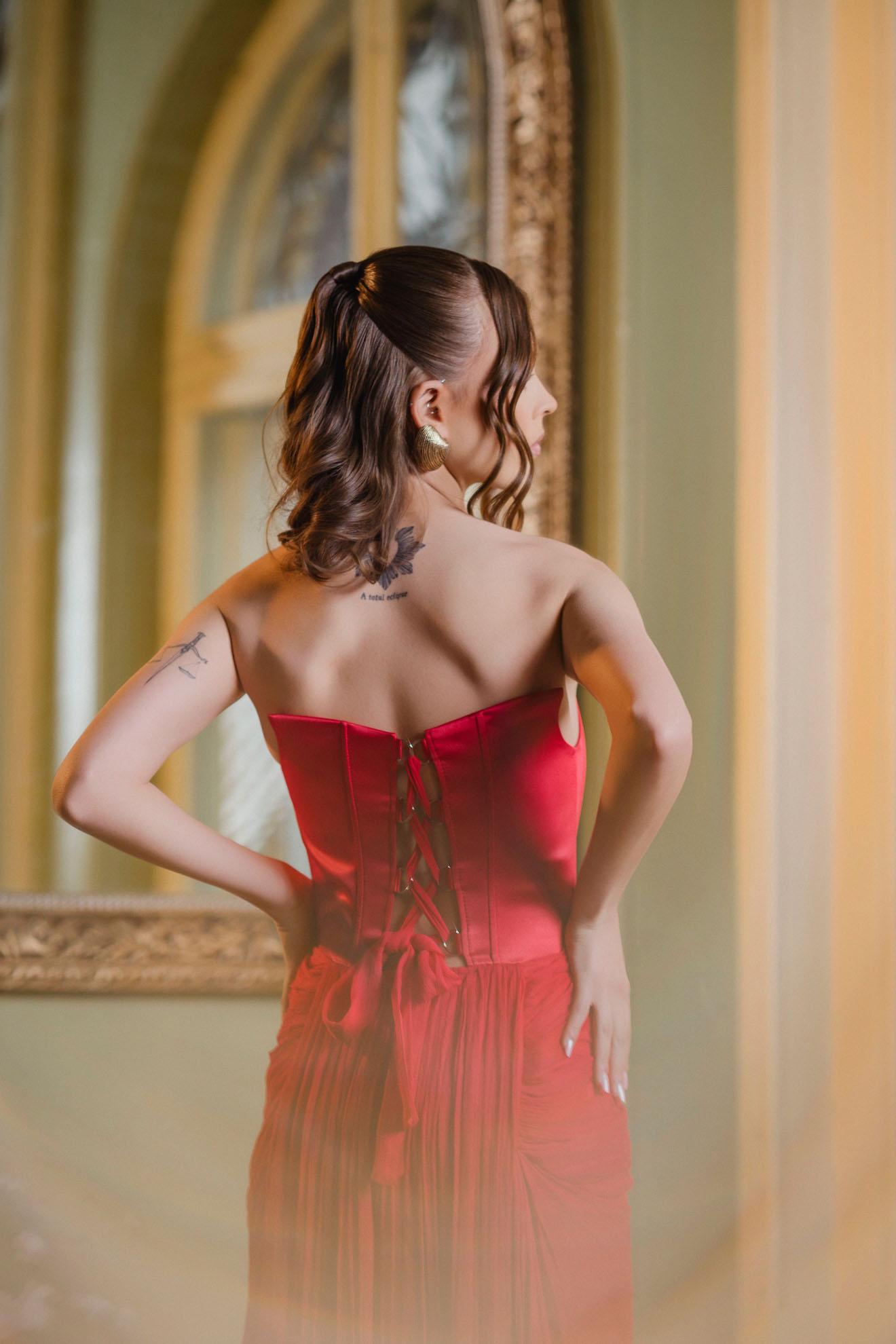 – Corset reglabil cu ate si fermoar ascuns pe fusta