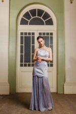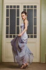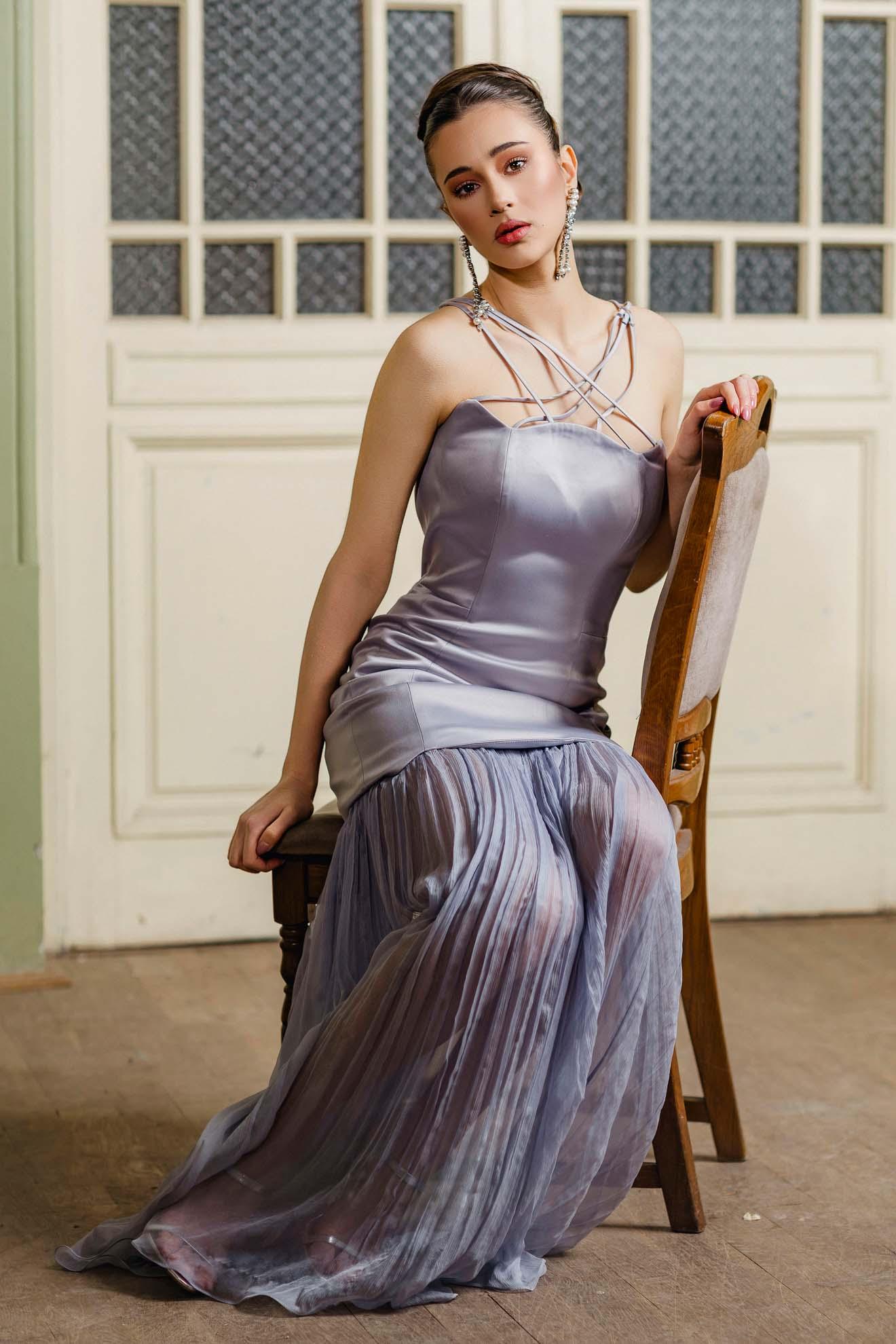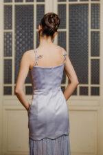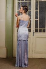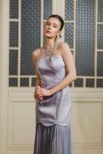 – Model cu corset si bretele subtiri, fusta din matase naturala in partea de jos