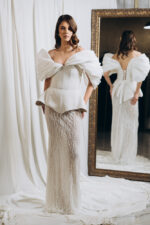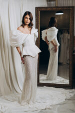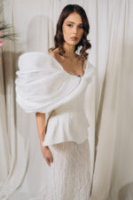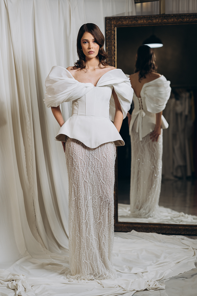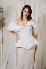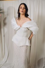 – Model cu decolteu in V in fata si in spate, fusta tip sirena, aplicatii din matase cu volum in partea de sus