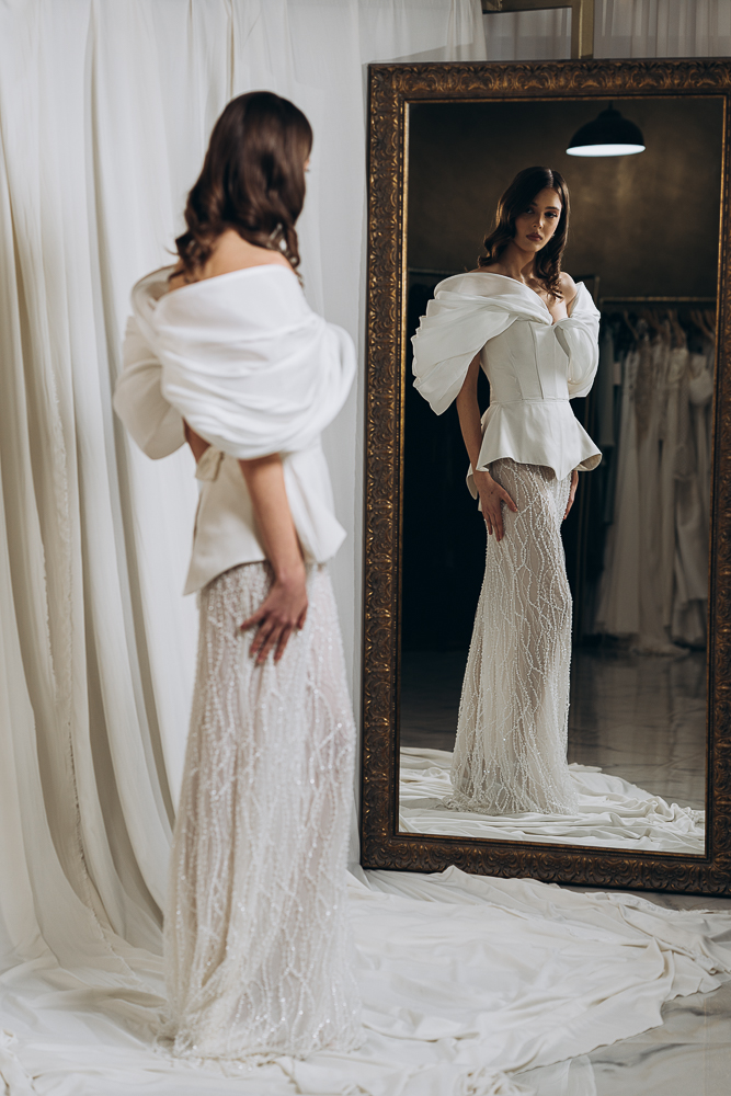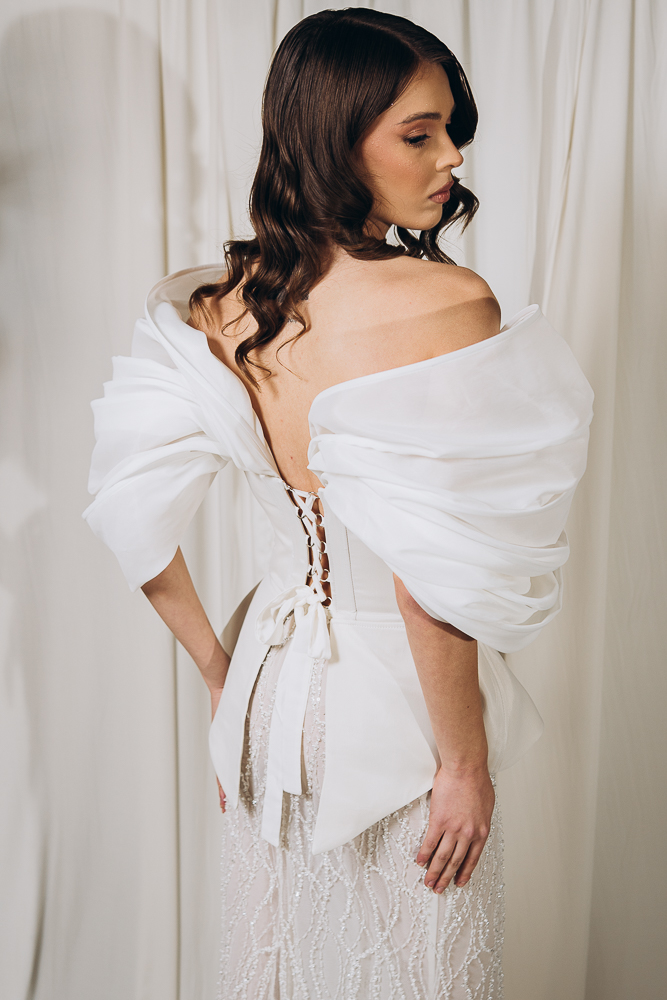 – Fermoar ascuns la spate pe fusta, corset reglabil