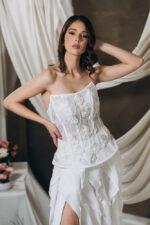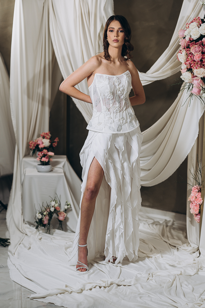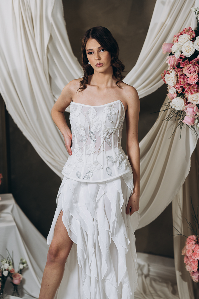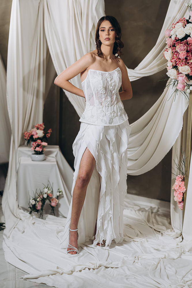 – Model fix pe talie si bust, lejer pe solduri, tinuta formata din 2 piese, corset si fusta, pentru a putea fi purtate si separat, cu alte ocazii, fusta din volane de matase aplicate in picioare pe fusta