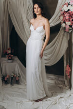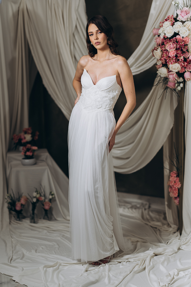 – Rochie cu corset integrat si dantela aplicata manual, fusta cu fronseuri