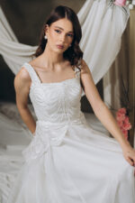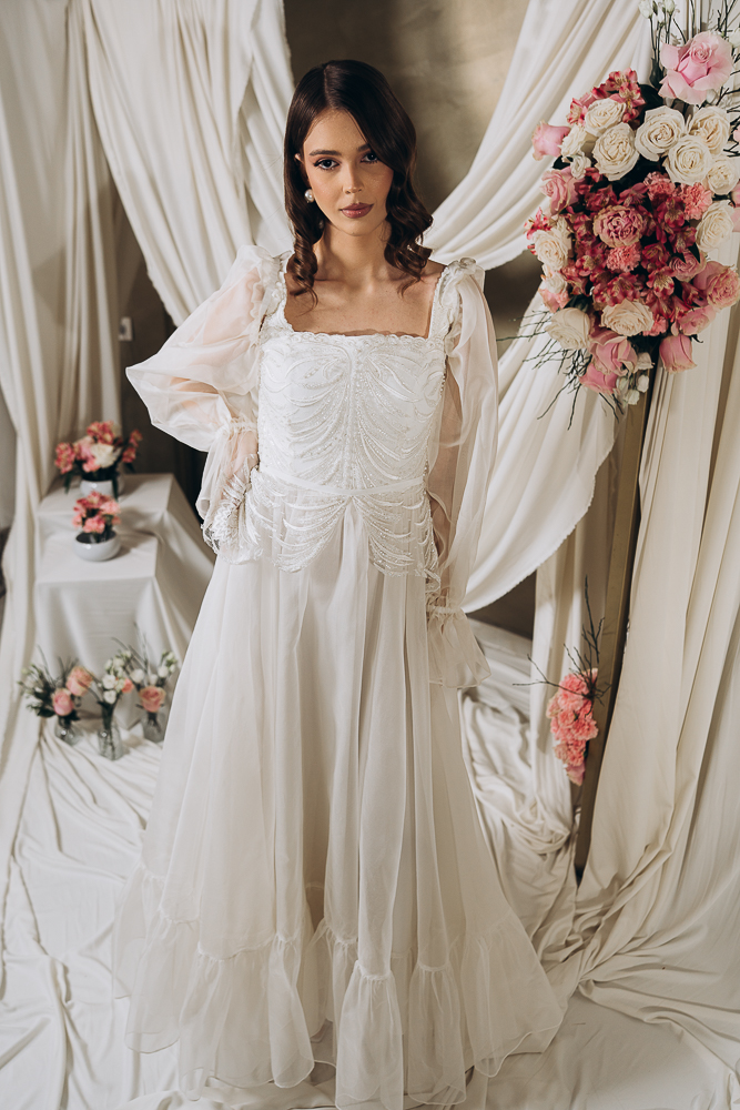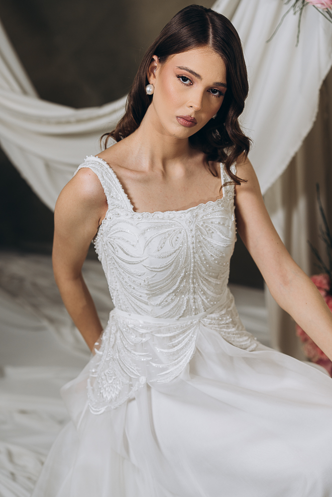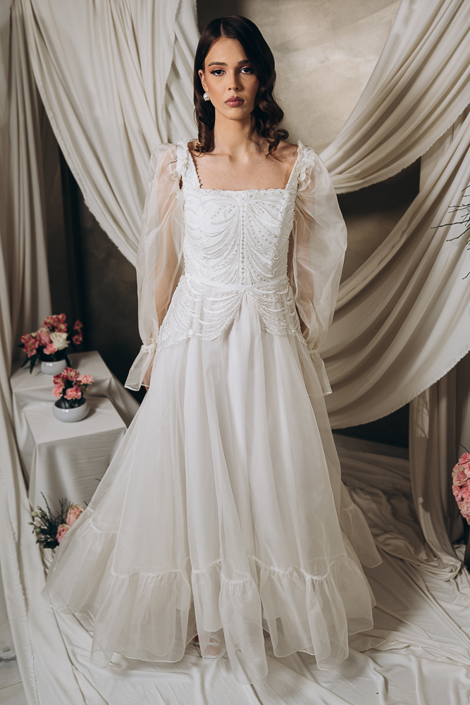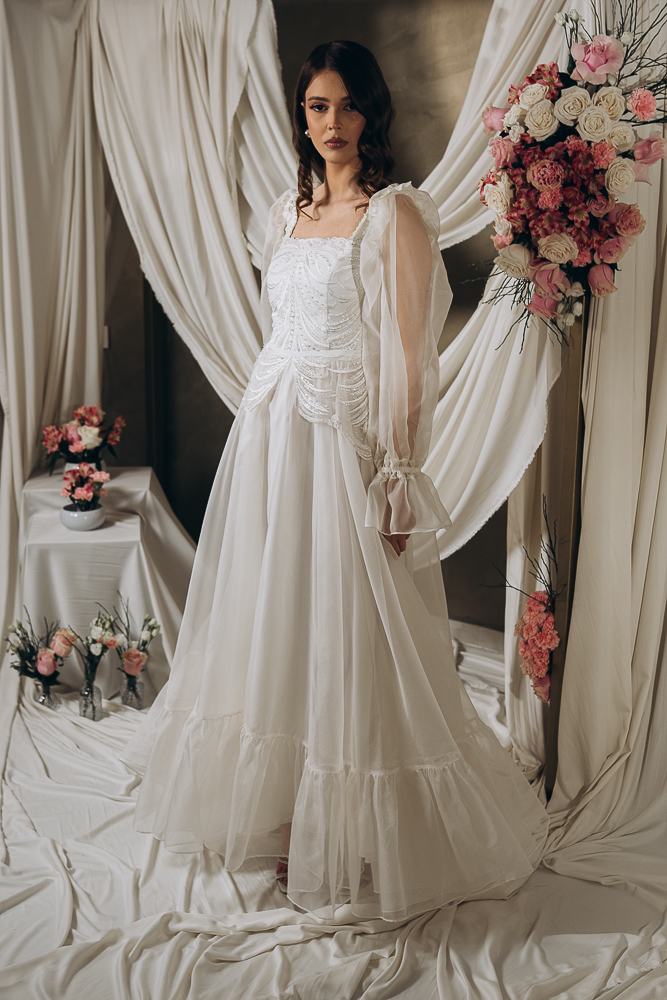 – Model cu datela aplicata pe bust, fusta cu volan aplicat in partea de jos, basc de dantela detasabil, maneci din organza detasabile.