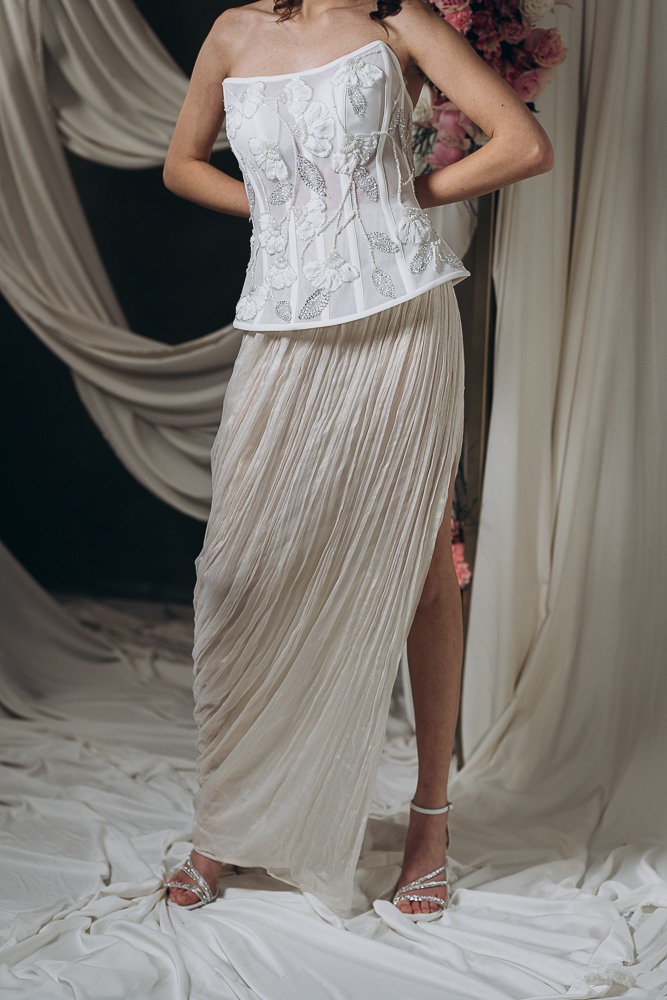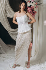 – Model fix pe talie si bust, lejer pe solduri, tinuta formata din 2 piese, corset si fusta, pentru a putea fi purtate si separat, cu alte ocazii