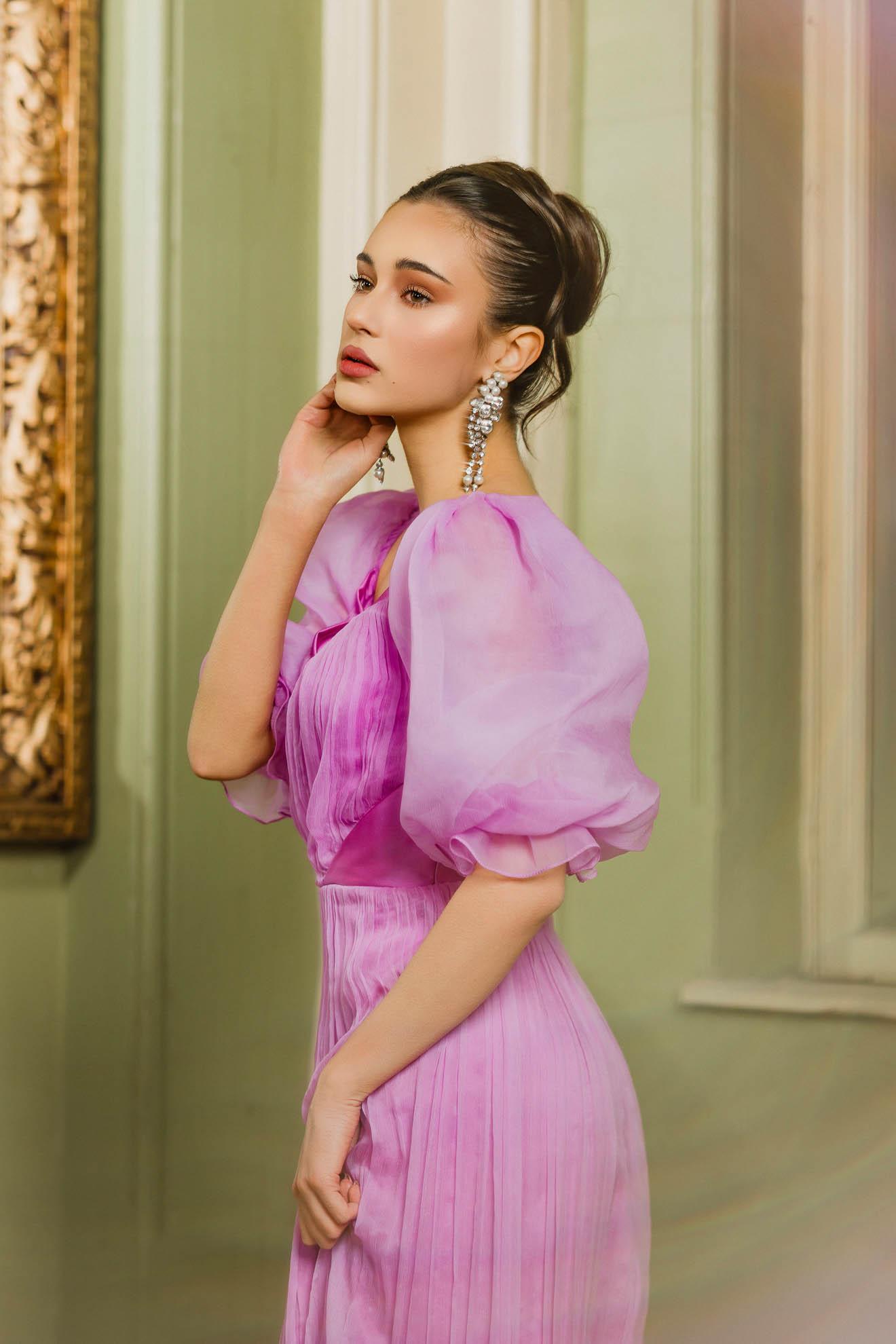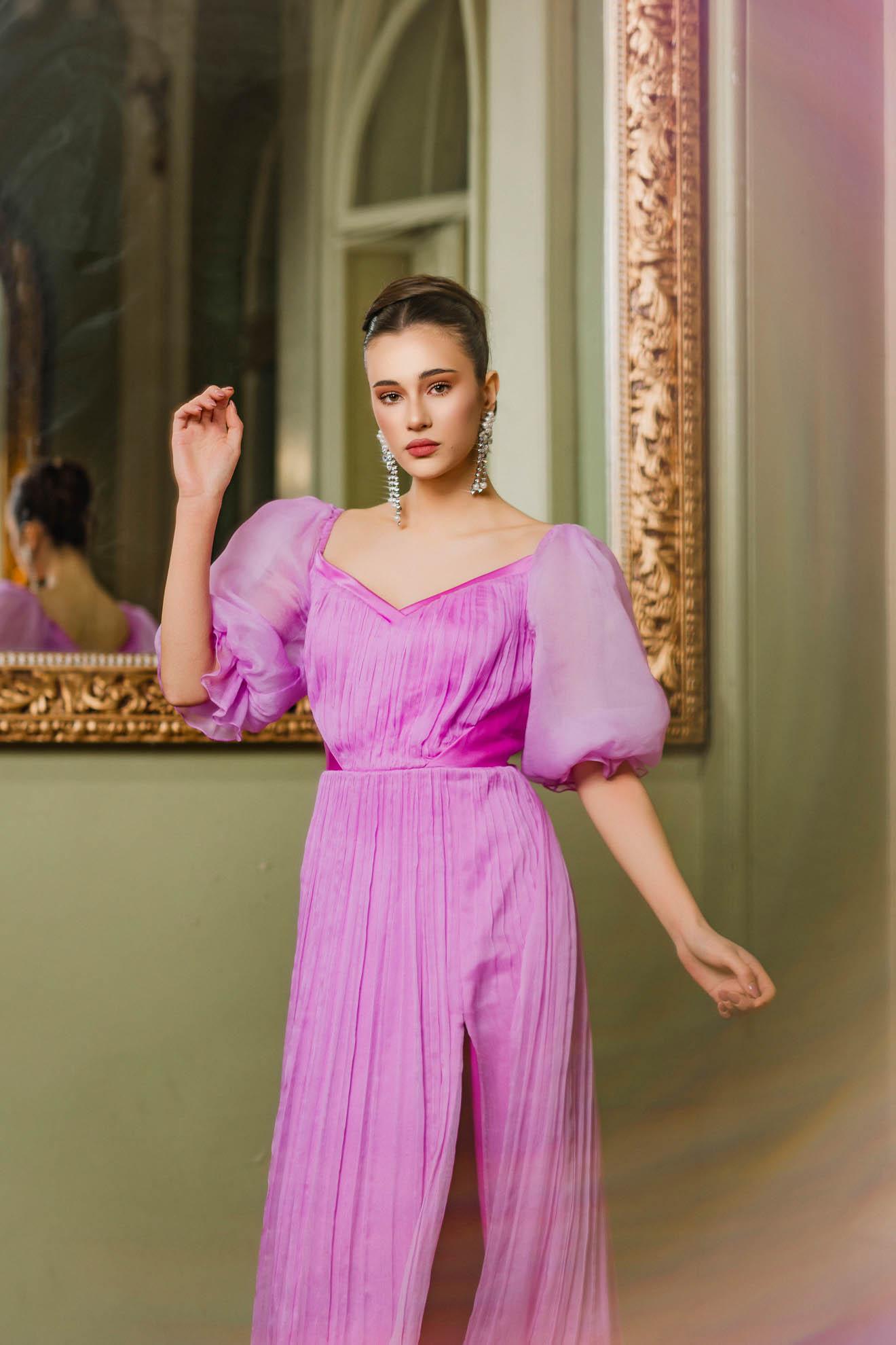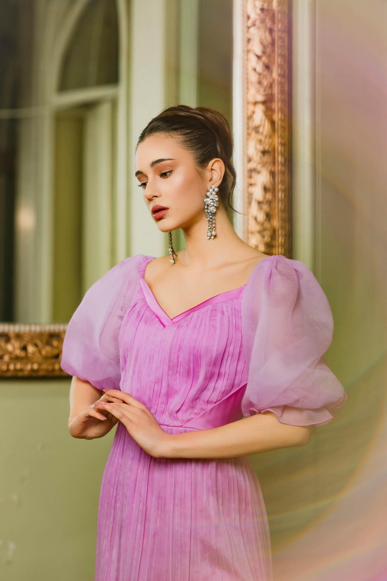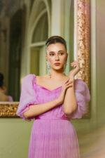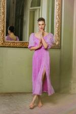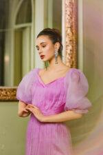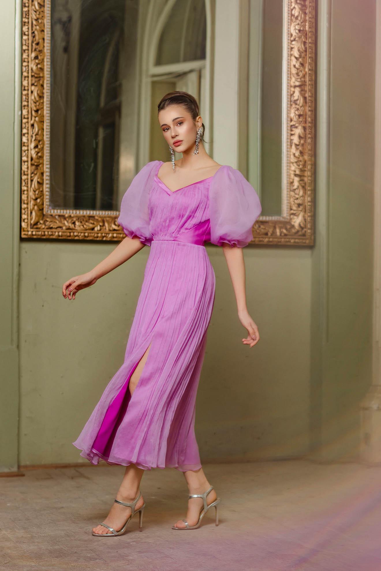 – Model cu decolteu in fata si in spate si maneci cu volum